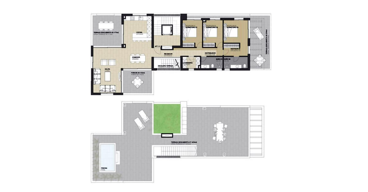 The rooftop terrace spans 143.4 m², with room for sunbathing, dining, and relaxing in your own private garden oasis. Optional upgrades include a mist vaporiser pergola for cooling comfort during hot Mallorca summers.