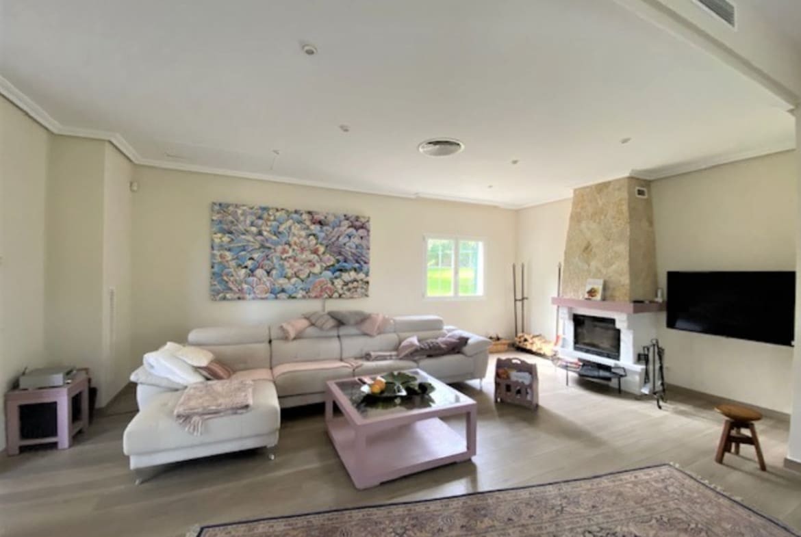 The villa has a double garage with ample storage space, plus a separate storage room and a guest toilet. To the right is the open kitchen, equipped with high-end appliances and a cozy dining area, which has direct access to the terrace, garden and pool. In front, the spacious living-dining room with fireplace and floor-to-ceiling windows offers uninterrupted views to the nature.