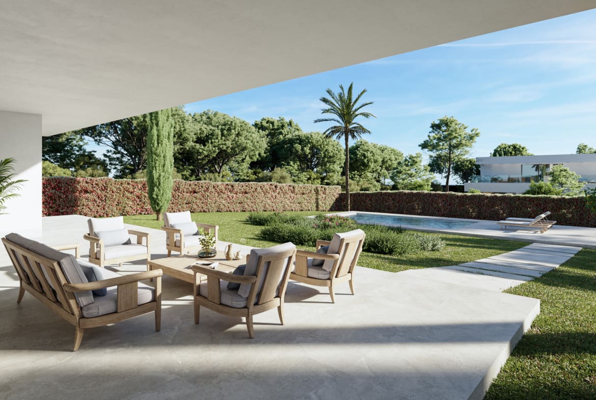 The exterior is a true oasis, with a private pool, large terraces and garden areas, perfect for enjoying the Mediterranean climate.