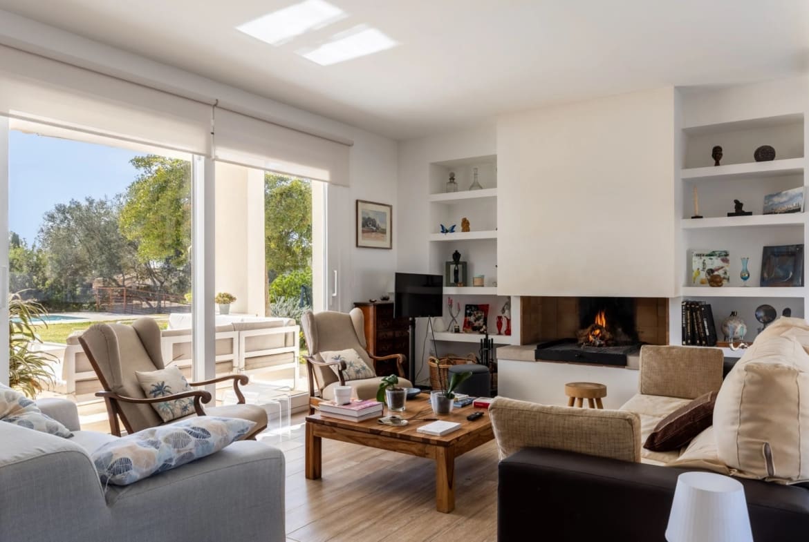 Inside, the villa’s bright and welcoming interiors feature an open-plan living and dining room with cozy wooden décor and fireplace, perfect for gatherings.
