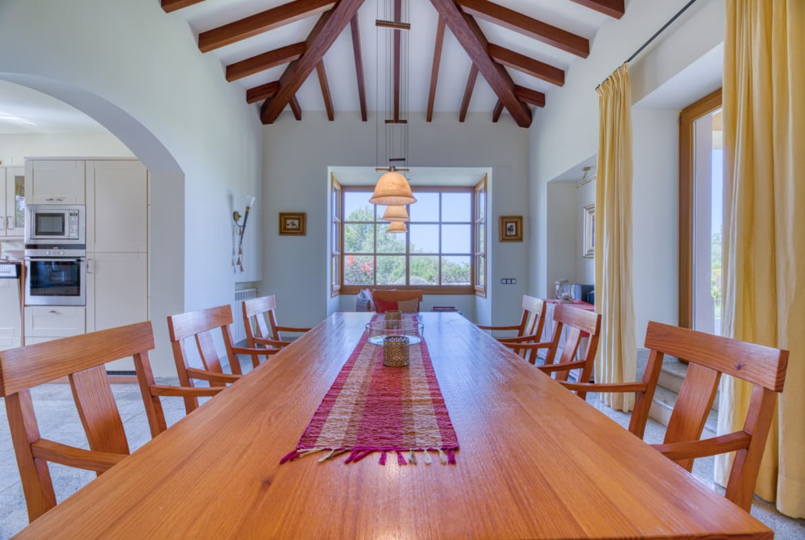 The property features an open plan kitchen, a spacious living-dining room with fireplace and a charming wooden beamed ceiling. It offers four bedrooms, three bathrooms en suite and a private guest apartment with separate entrance.